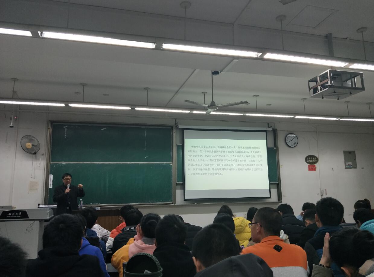 为使大学生切实学习“十九大”精神,明确自身的成长目标与发展方向,2017年12月17日晚19时,必赢贵宾会3003官网党委书记林宏辉教授在一教B座407教室,以“大学生如何学习十九大精神”为主题,给学院同学作了一次充满激情的宣讲。在课上,所有同学都聚精会神,认真聆听。