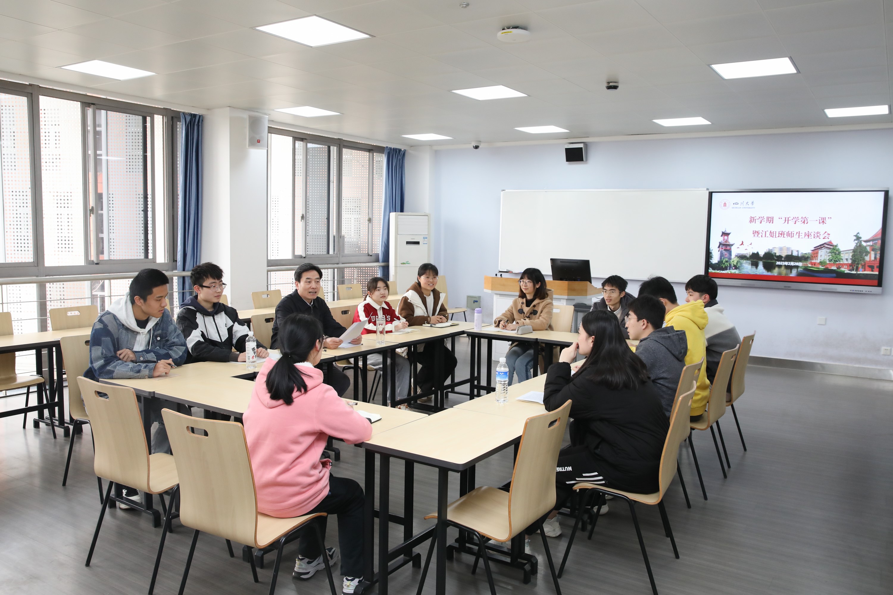 课堂上,甘霖与同学们围坐在一起,亲切询问了同学们的学习生活情况,认真倾听了同学们对大学生活的认识和规划,详细了解和解答了同学们在学习生活中的困惑,并与同学们共同回顾了我们党领导人民3年抗疫的伟大实践,嘱咐同学们站在新时代、新起点,以崭新的面貌投入到新阶段的学习中来。希望大家在实践中学习,在亲历中成长,胸怀家国、勤奋学习、加强锻炼、慎思明辨、笃行致远,培养良好的兴趣爱好,争做德智体美劳全面发展的社会主义建设者和接班人。