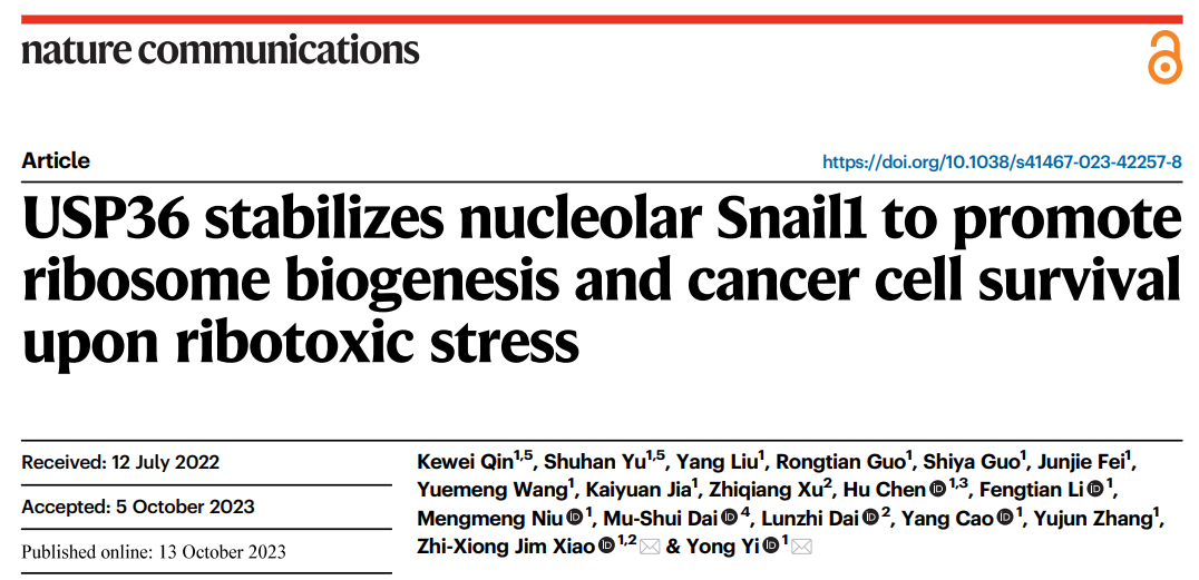 近日,必赢贵宾会3003官网肖智雄/易勇团队在Nature Communications在线发表了题为USP36 stabilizes nucleolar Snail1 to promote ribosome biogenesis and cancer cell survival upon ribotoxic stress的研究论文。该研究揭示核仁Snail1促进的核糖体生物合成是肿瘤细胞抵抗HHT/核糖体毒性应激的关键机制。