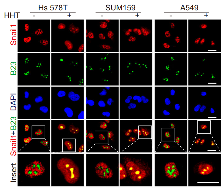 Snail1蛋白作为EMT(上皮-间充质转化)的重要转录因子主要定位于核质中,在肿瘤生存、转移、及干性等方面发挥着重要调控作用。本研究发现, HHT可显著促进Snail1蛋白在核仁中聚集(图一),增加的Snail1蛋白通过上调47S rRNA的表达,从而促进核糖体生物合成及肿瘤细胞存活。